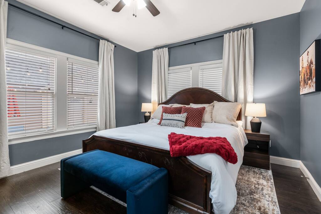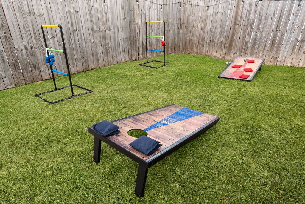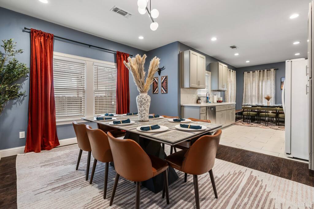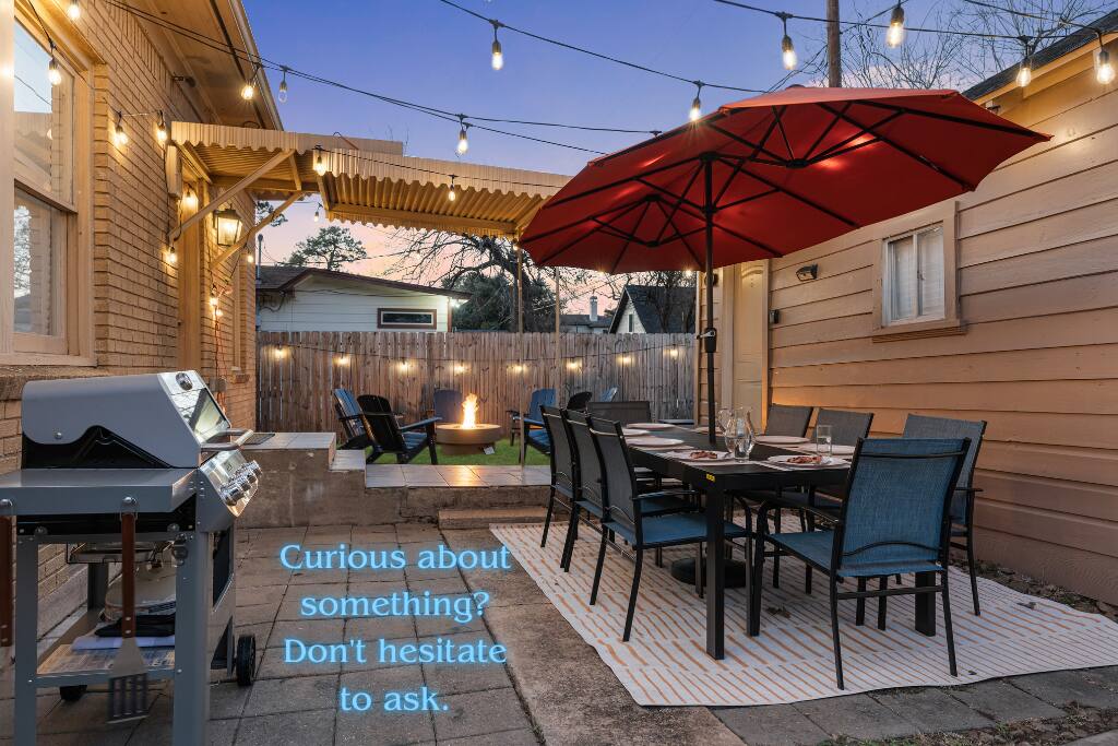 The proximity to everything! âHouston Zoo: 10 minutes âDiscovery Green: 9 minutes âHermann Park: 8 minutes away âBuffalo Bayou Park: 10 minutes âMarket Square Park: 13 minutes âThe Menil Collection: 10 minutes âDowntown Aquarium: 10 minutes âMuseum of Fine Arts, Houston: 8 minutes âHouston Museum of Natural Science: 8 minutes As you arrive at our cozy retreat, you'll be greeted by the charming front of the house. The spacious driveway provides parking for up to six cars. Through the front door, the luxuriously rustic living room is a great place to kick up your feet. Featuring comfortable sofas and a 65 inch flat screen TV for your comfort and entertainment. The warm colors of the Western decor make a perfect spot to unwind after a day in Houston. Continue through the living area into the dining room, where you will find a large table that comfortably seats eight but can expand to accommodate all 12 guests. The room is tastefully decorated with Texan-themed artwork and accents, creating a relaxing dining experience. This space is perfect for family meals or entertaining guests. You will also find a variety of games in the buffet for your party to play after meals including Scrabble, Uno, Chess, and Scattergories. Past the dining room is the fully equipped kitchen and ample counter space. The kitchen offers everything you need to prepare a delicious meal, with a view into the adjacent family room. The open-concept design ensures that the cook is never left out of the conversation. Beyond the kitchen, enter the open-concept breakfast nook, a cozy space perfect for relaxation. It features comfortable chairs and benches with cowboy accentsâ ideal for snacks, casual meals, or a quick game with the family. Youâll find the microwave, Keurig coffee maker, and cups of coffee and hot chocolate nearby. The Master Bedroom with Ensuite The spacious master bedroom features a comfortable king bed, a large closet for all your storage needs, and a flat-screen TV for your entertainment. Enjoy the convenience of the ensuite bathroom. The Bunk Room Perfect for kids or extended family, this fun room features two bunk beds that can sleep up to eight guests. The beds include four full-size beds. A large closet, a dresser, and cubes provide ample storage space. The Sofa Room To the right of the living room, youâll find a modern yet comfortable sofa room with a touch of bohemian flair. Stocked with small board games like tic tac toe and connect four, a smaller group can find some quiet in this room with the opportunity to sleep afterwards on the queen sized pullout mattress within. Wake to natural daylight with the large bay window behind the blackout curtains. The Outdoor Experience Step outside to discover a space designed for relaxation and entertainment. Fire up the gas grill for a delicious barbecue while enjoying the fresh air and sunshine. Gather around the spacious outdoor dining table, comfortably seating eight under a large umbrella, perfect for al fresco meals any time of day. As the sun sets, the ambiance transforms with the warm glow of the gas fire pit, creating a cozy setting for conversation and laughter. Explore a variety of seating options to suit every mood. Sink into one of the six Adirondack chairs strategically placed around the fire pit, ideal for intimate chats and roasting marshmallows. For more casual lounging, two comfortable seats beckon you to unwind with plush cushions and inviting designs. Whether you're sipping your morning coffee or enjoying an evening cocktail, the patio provides the perfect spot to relax. Beyond the comfortable seating, the fun continues with an array of outdoor games. Challenge your friends and family to a round of giant Jenga, test your aim with ladder ball, or try your hand at a classic game of cornhole. These activities are sure to bring out the competitive spirit and create lasting memories. With something for everyone, our outdoor space ensures that there's never a dull moment. Nearby Adventures âKayak or paddleboard Buffalo Bayou's trails. âClimb the walls at Texas Rock Gym. âSoar indoors at iFly Houston's wind tunnel. âHike or bike through Memorial Park's trails. âZipline through trees at nearby parks. âOff-road ATV adventure at Xtreme Off Road Park. âExplore the Houston Arboretum's nature trails. âPaintball at Urban War Zone âTake a scenic helicopter tour of Houston with Leading Edge The Sagebrush Retreat is more than just a place to stay â it's an experience. From the moment you check in, you'll be immersed in a world of comfort, entertainment, and beauty. Whether you're hosting a gathering, enjoying a family barbecue, or simply seeking a peaceful retreat, our amenities provide the perfect backdrop for an unforgettable getaway.