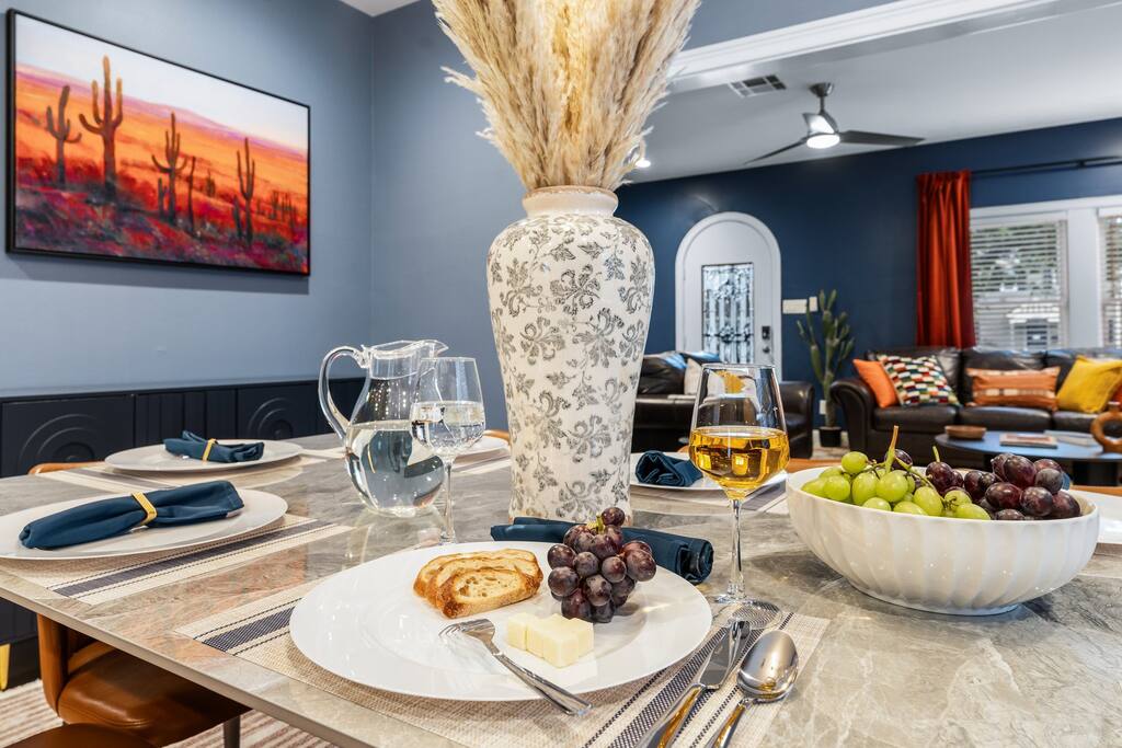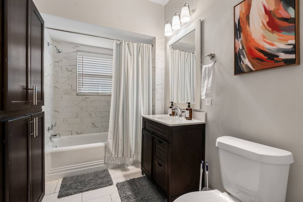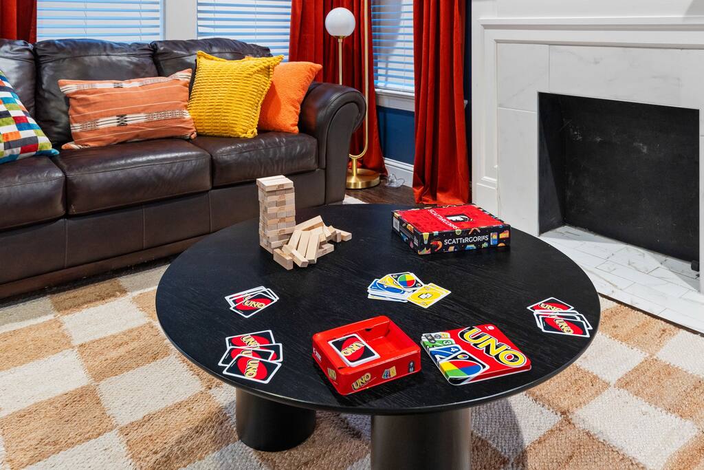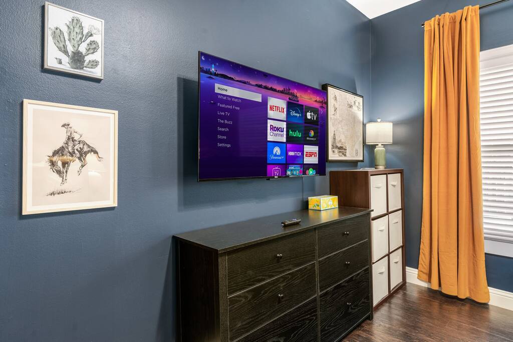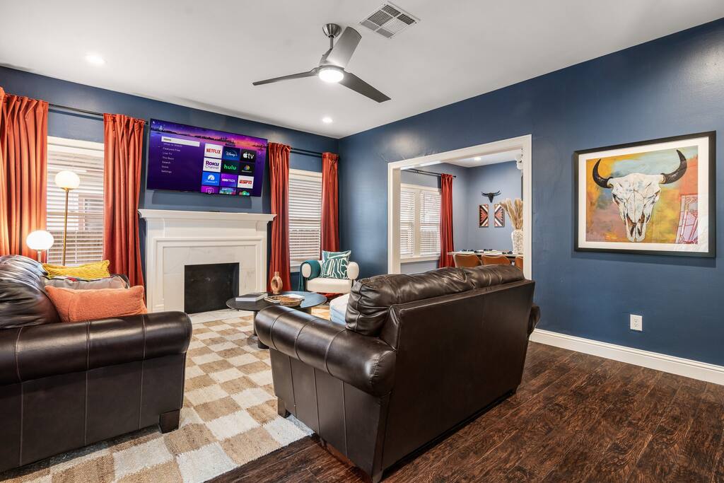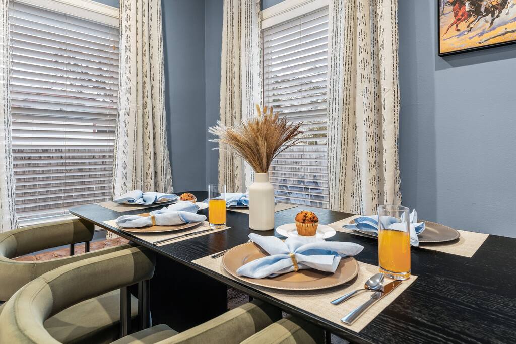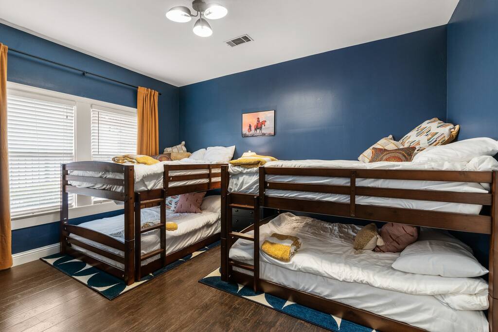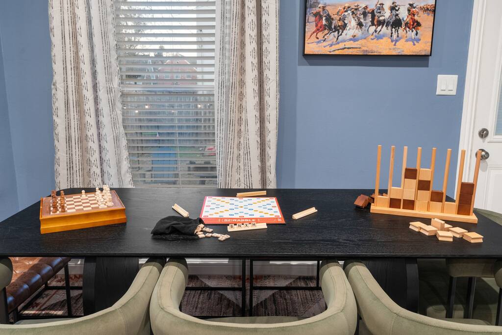 The proximity to everything! âHouston Zoo: 10 minutes âDiscovery Green: 9 minutes âHermann Park: 8 minutes away âBuffalo Bayou Park: 10 minutes âMarket Square Park: 13 minutes âThe Menil Collection: 10 minutes âDowntown Aquarium: 10 minutes âMuseum of Fine Arts, Houston: 8 minutes âHouston Museum of Natural Science: 8 minutes As you arrive at our cozy retreat, you'll be greeted by the charming front of the house. The spacious driveway provides parking for up to six cars. Through the front door, the luxuriously rustic living room is a great place to kick up your feet. Featuring comfortable sofas and a 65 inch flat screen TV for your comfort and entertainment. The warm colors of the Western decor make a perfect spot to unwind after a day in Houston. Continue through the living area into the dining room, where you will find a large table that comfortably seats eight but can expand to accommodate all 12 guests. The room is tastefully decorated with Texan-themed artwork and accents, creating a relaxing dining experience. This space is perfect for family meals or entertaining guests. You will also find a variety of games in the buffet for your party to play after meals including Scrabble, Uno, Chess, and Scattergories. Past the dining room is the fully equipped kitchen and ample counter space. The kitchen offers everything you need to prepare a delicious meal, with a view into the adjacent family room. The open-concept design ensures that the cook is never left out of the conversation. Beyond the kitchen, enter the open-concept breakfast nook, a cozy space perfect for relaxation. It features comfortable chairs and benches with cowboy accentsâ ideal for snacks, casual meals, or a quick game with the family. Youâll find the microwave, Keurig coffee maker, and cups of coffee and hot chocolate nearby. The Master Bedroom with Ensuite The spacious master bedroom features a comfortable king bed, a large closet for all your storage needs, and a flat-screen TV for your entertainment. Enjoy the convenience of the ensuite bathroom. The Bunk Room Perfect for kids or extended family, this fun room features two bunk beds that can sleep up to eight guests. The beds include four full-size beds. A large closet, a dresser, and cubes provide ample storage space. The Sofa Room To the right of the living room, youâll find a modern yet comfortable sofa room with a touch of bohemian flair. Stocked with small board games like tic tac toe and connect four, a smaller group can find some quiet in this room with the opportunity to sleep afterwards on the queen sized pullout mattress within. Wake to natural daylight with the large bay window behind the blackout curtains. The Outdoor Experience Step outside to discover a space designed for relaxation and entertainment. Fire up the gas grill for a delicious barbecue while enjoying the fresh air and sunshine. Gather around the spacious outdoor dining table, comfortably seating eight under a large umbrella, perfect for al fresco meals any time of day. As the sun sets, the ambiance transforms with the warm glow of the gas fire pit, creating a cozy setting for conversation and laughter. Explore a variety of seating options to suit every mood. Sink into one of the six Adirondack chairs strategically placed around the fire pit, ideal for intimate chats and roasting marshmallows. For more casual lounging, two comfortable seats beckon you to unwind with plush cushions and inviting designs. Whether you're sipping your morning coffee or enjoying an evening cocktail, the patio provides the perfect spot to relax. Beyond the comfortable seating, the fun continues with an array of outdoor games. Challenge your friends and family to a round of giant Jenga, test your aim with ladder ball, or try your hand at a classic game of cornhole. These activities are sure to bring out the competitive spirit and create lasting memories. With something for everyone, our outdoor space ensures that there's never a dull moment. Nearby Adventures âKayak or paddleboard Buffalo Bayou's trails. âClimb the walls at Texas Rock Gym. âSoar indoors at iFly Houston's wind tunnel. âHike or bike through Memorial Park's trails. âZipline through trees at nearby parks. âOff-road ATV adventure at Xtreme Off Road Park. âExplore the Houston Arboretum's nature trails. âPaintball at Urban War Zone âTake a scenic helicopter tour of Houston with Leading Edge The Sagebrush Retreat is more than just a place to stay â it's an experience. From the moment you check in, you'll be immersed in a world of comfort, entertainment, and beauty. Whether you're hosting a gathering, enjoying a family barbecue, or simply seeking a peaceful retreat, our amenities provide the perfect backdrop for an unforgettable getaway.